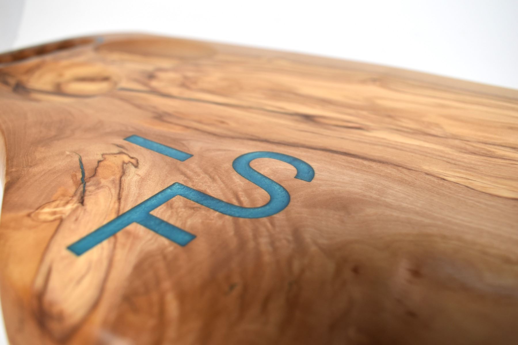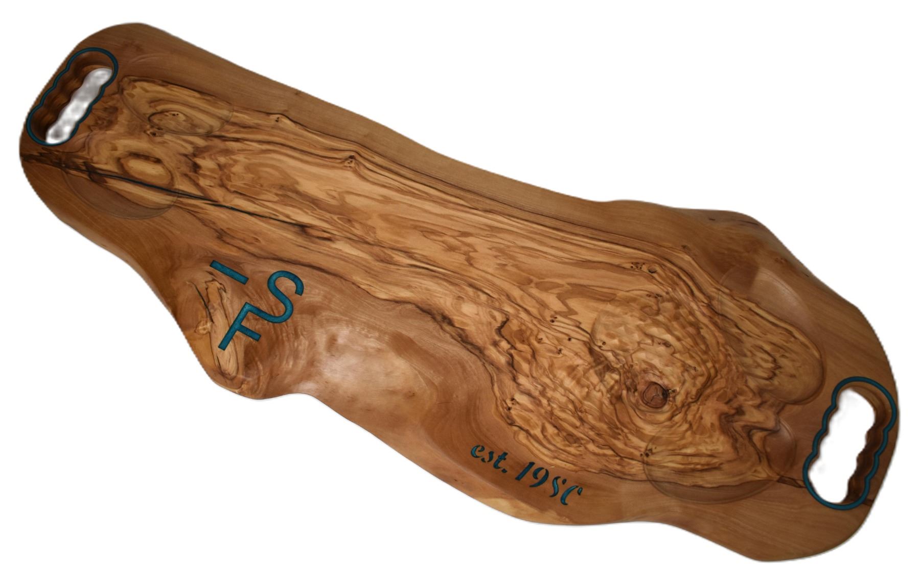 Olive wood charcuterie board handmade with blue resin accents and the Stockmen’s brand, 26”x9”