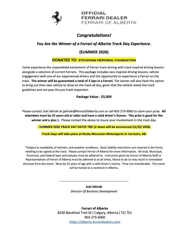This package includes race inspired driving lessons, vehicle engagement with one of our experienced drivers and the opportunity to experience a Ferrari on the track. The winner will be guaranteed a total of 5 laps in a Ferrari. The winner will also have the option to bring out their own vehicle to drive on the track all day, given that the vehicle meets the track guidelines and can pass the pre-track inspection.