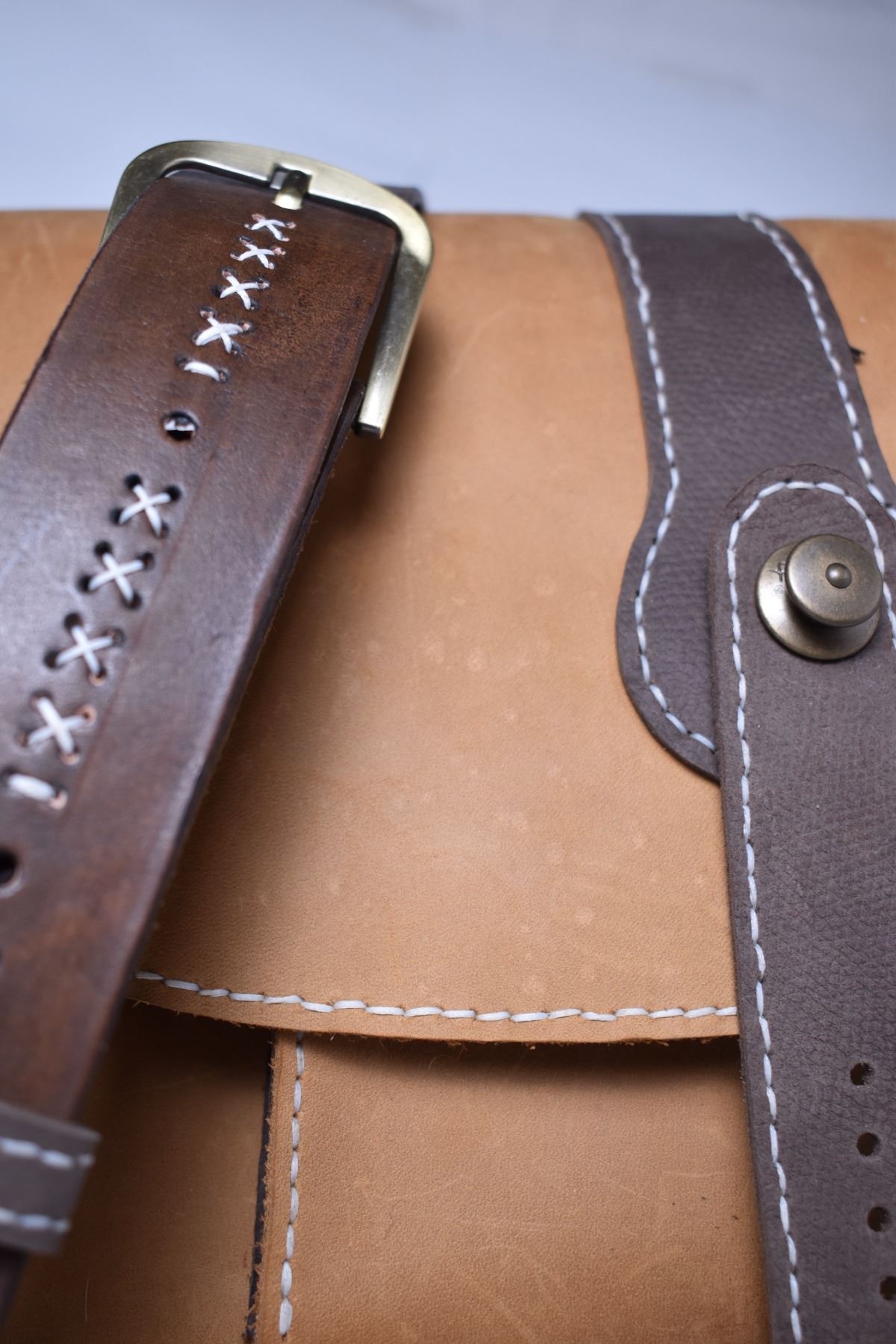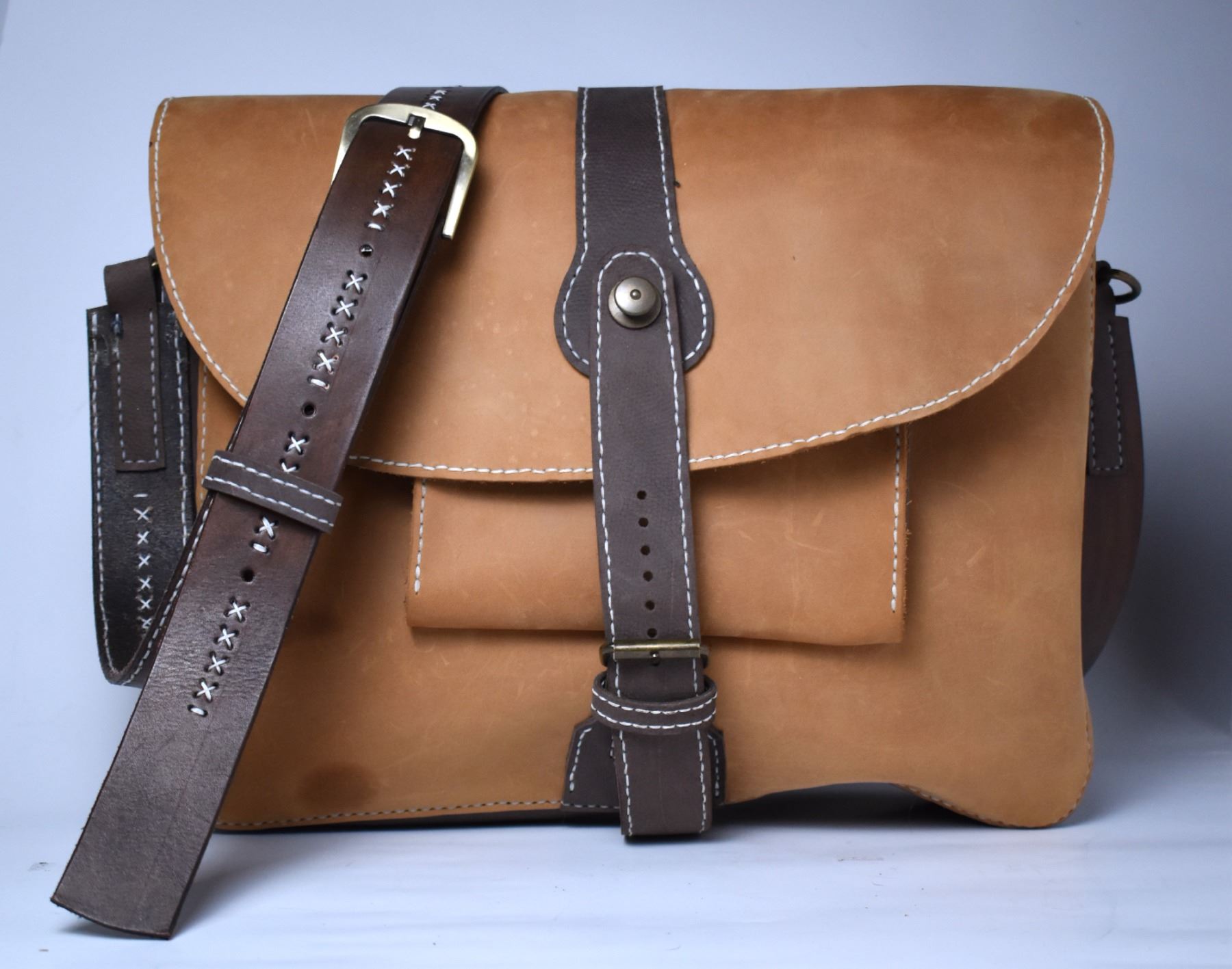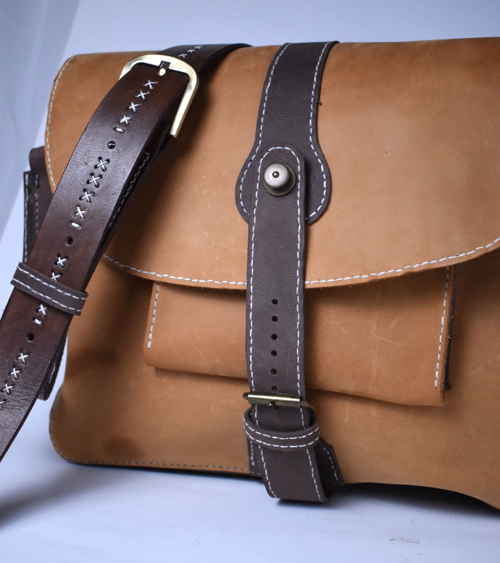 Handmade leather messenger bag with dual-toned leather and adjustable strap