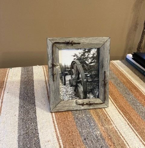 Old Weathered Wagon Photo in Barbed Wire Barnwood Frame 11" x 13"