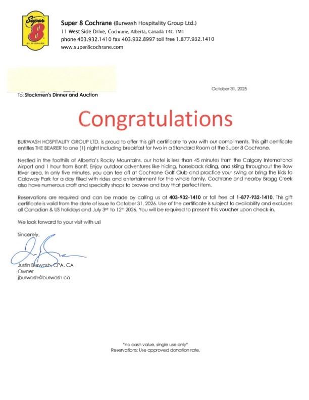 Donated by: Burwash Hospitality Group Ltd. Super 8 Cochrane