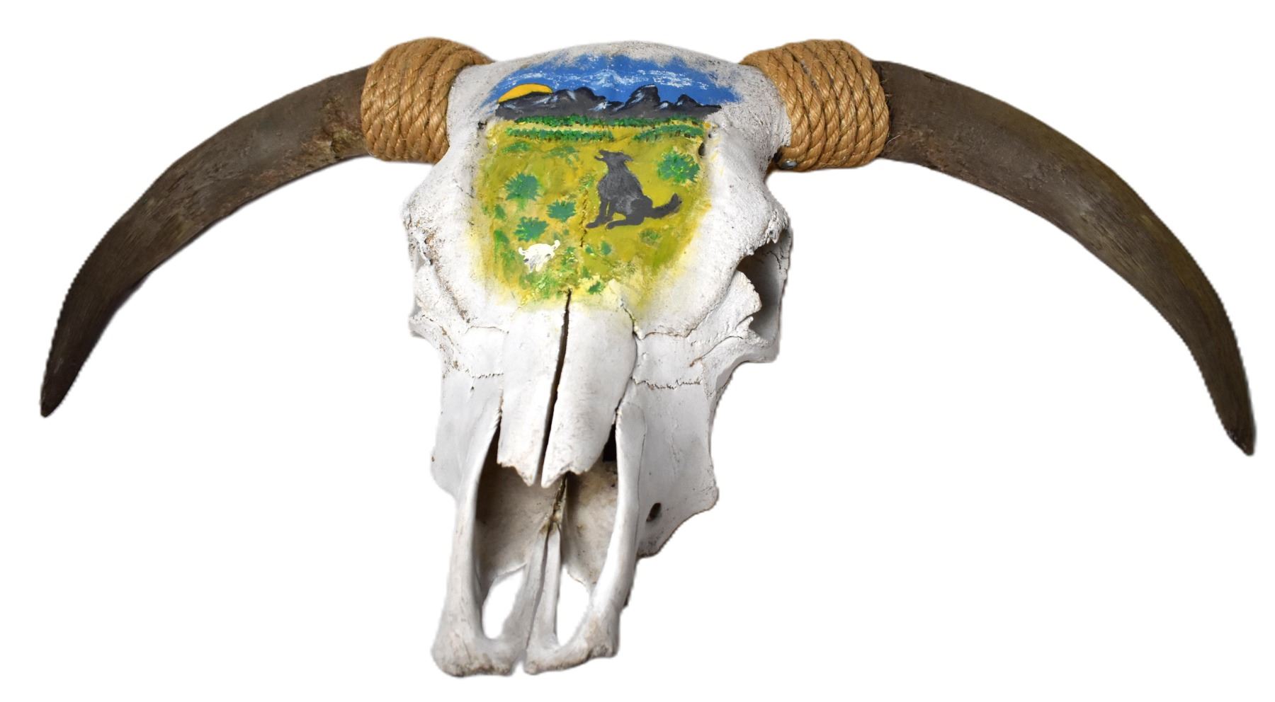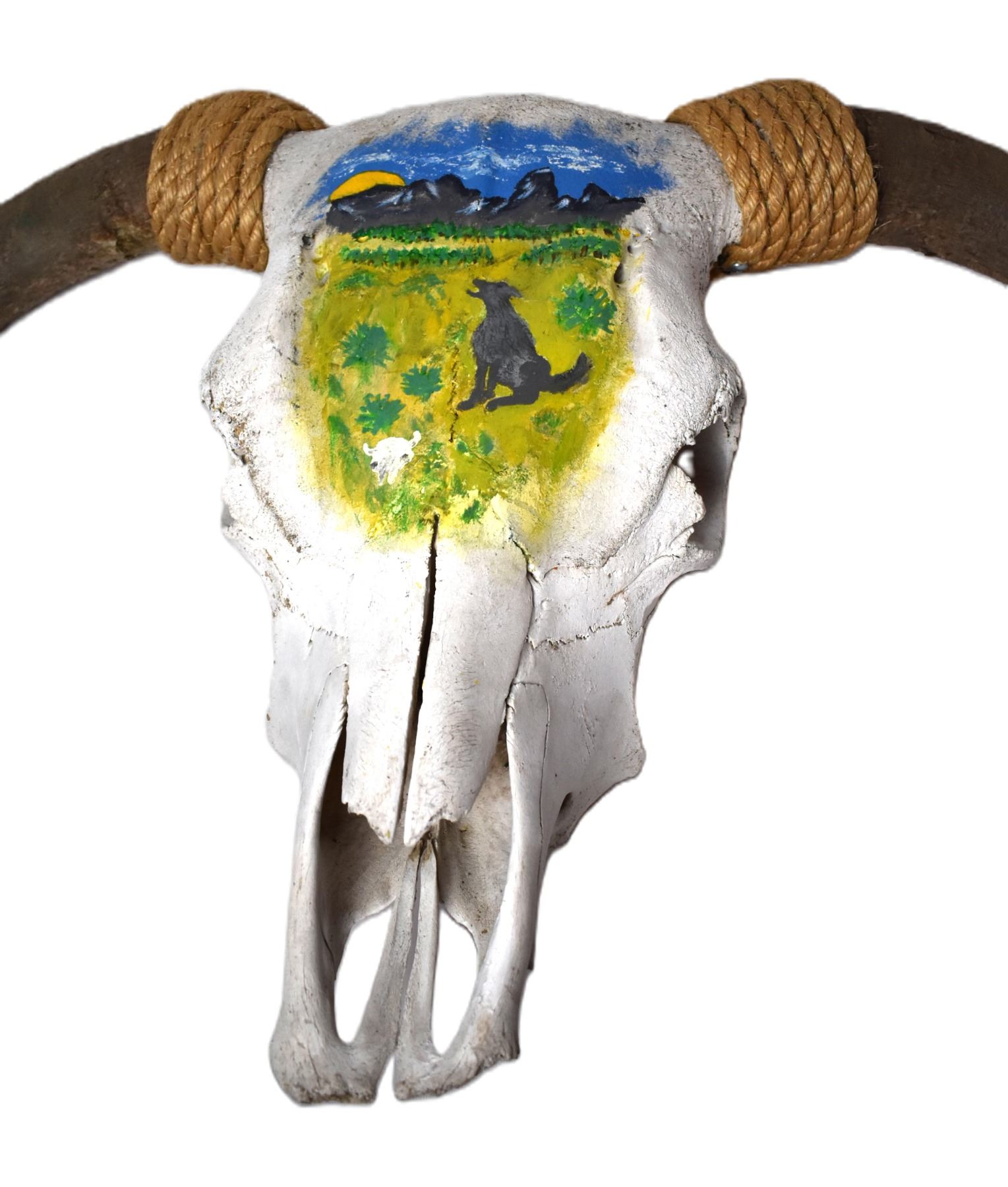 Hand painted horned Hereford bull skull with jute rope around the horns