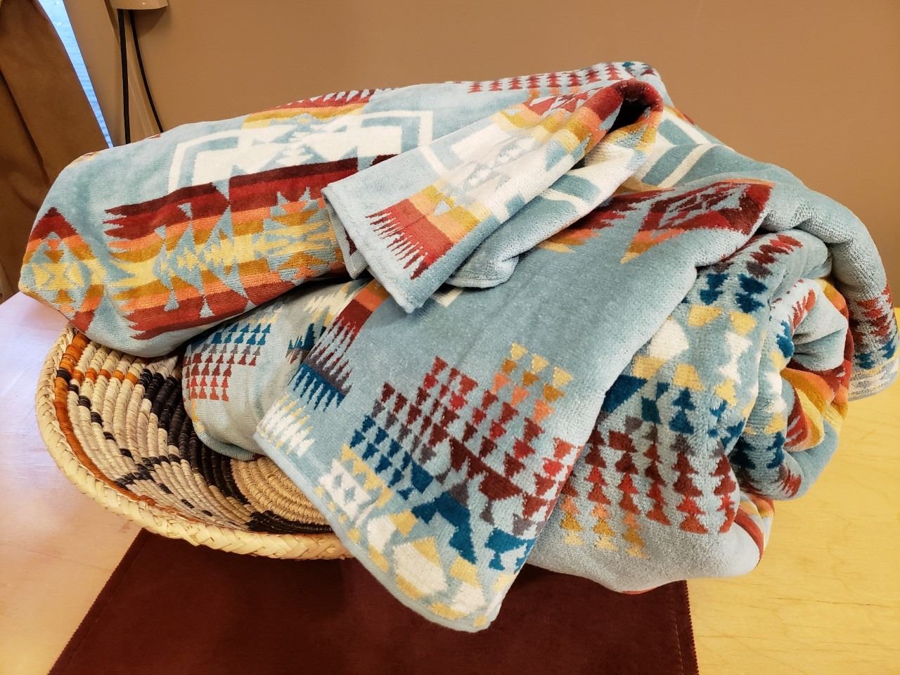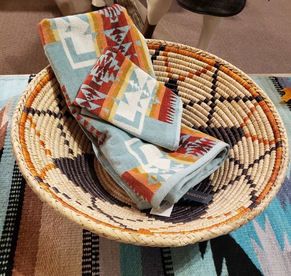 Pendleton Towel Set (2 Bath, 1 Hand, 1 Facecloth) and Southwestern Basket