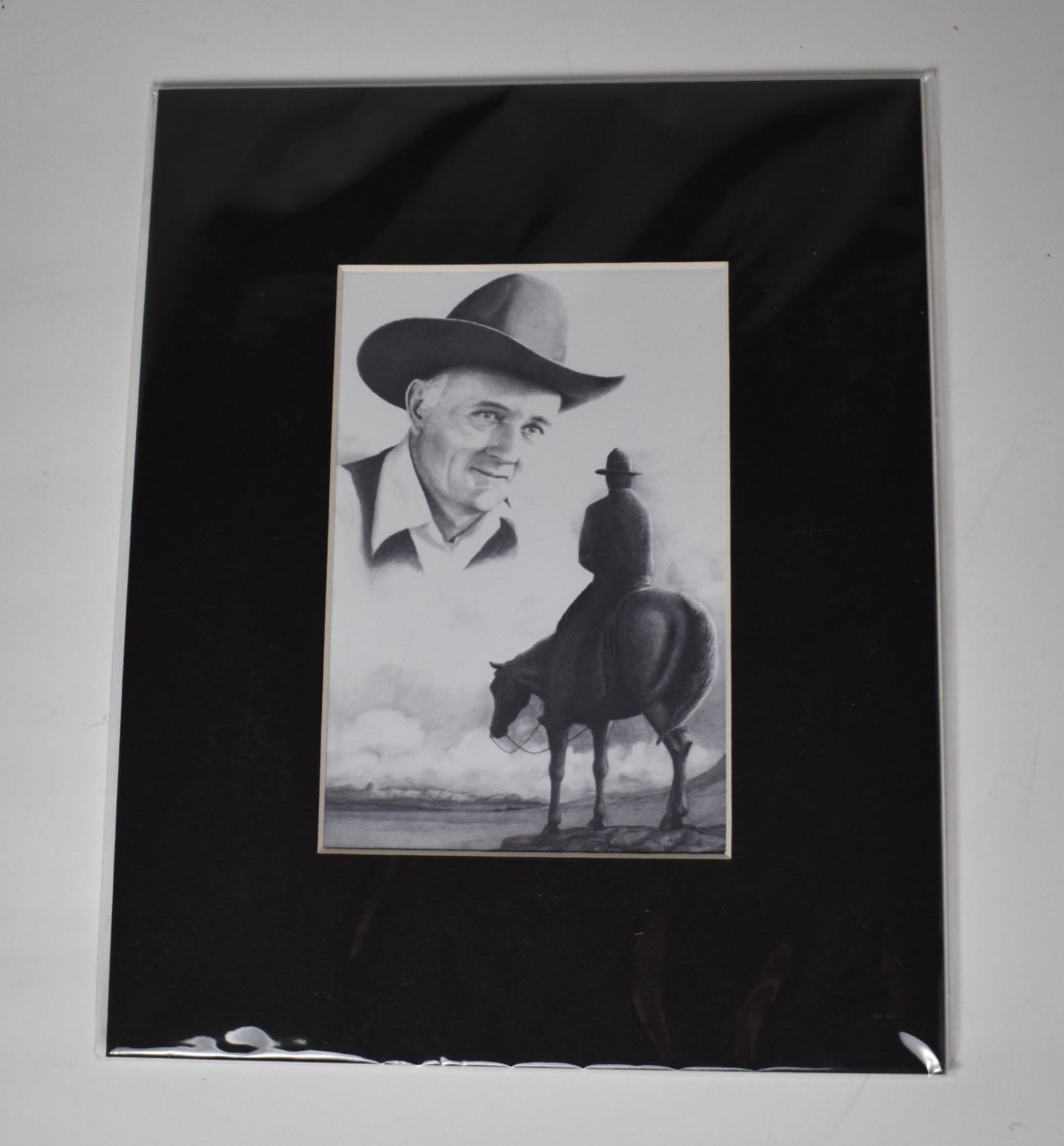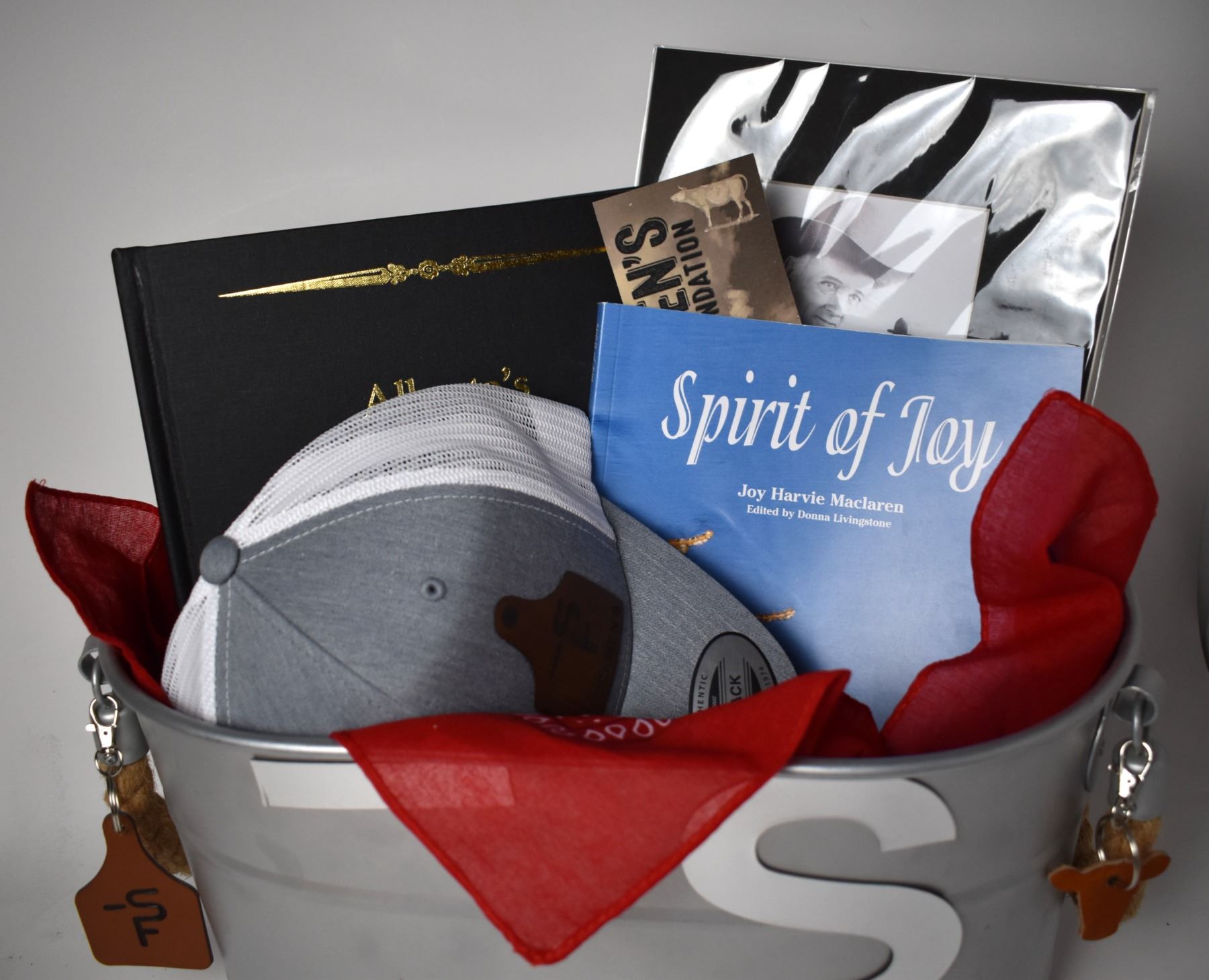2014 Alberta Brand Book; Spirit of Joy, book by Joy Harvie Maclaren; Matted Print of ‘Legacy’ by Merv Robertson featuring Mac MacKenzie and his Men of Vision Statue; Stockmen’s Baseball Hat; Stockmen’s Magnets and Keychains